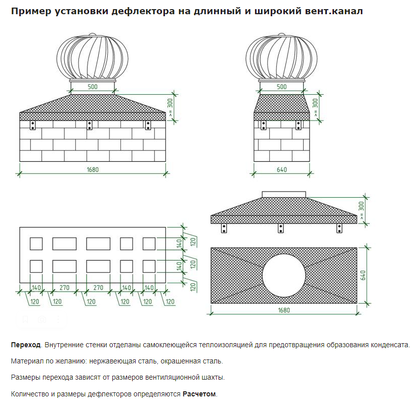 Турбодефлектор можно установить как в частном доме или коттедже на вентиляционную трубу, так и на многоквартирный жилой дом. Установка турбодефлектора увеличит тягу в вентиляционном канале в 4 раза. Установить турбодефлектор можно как на круглую трубу, так и на крышу, используя плоское основание, или на квадратную трубу, используя квадратный переход с теплоизоляцией. Если ваш вентвыход нестандартный, свяжитесь пожалуйста с нашим менеджером и укажите размеры вентвыхода. Наш менеджер поможет с выбором перехода или плоского основания. Если же у вас круглая труба, то замерьте диаметр трубы и выберите подходящий турбодефлектор из нашего каталога.